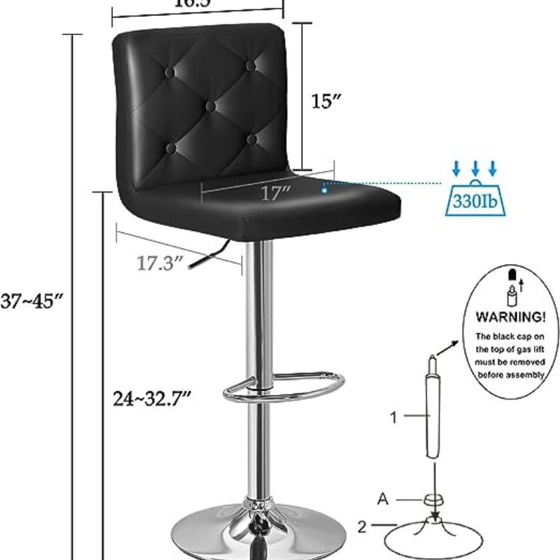 - What You Concern More: 330 pound Max load capacity for one stool; cushion dimension:16.9 X 15.4 inches; back dimension:16.9 X12.6inches; adjustable seat height: from 24.4 to 32.7 inches